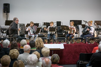 Seit 2008 fördert die HARMONIA den musikalischen Nachwuchs. Jeden Samstag Vormittag widmet sich Carlo Plaum (studierter Musikpädagoge) mit viel Spaß und Witz den Kindern - beginnend mit der musikalischen Früherziehung bis zum Einzelunterricht bei den Fortgeschrittenen. Das Akkordeon ist für den Musikunterricht das optimale Instrument, denn zum einen kann man hier relativ früh musikalische Erfolge erzielen, zum anderen werden hier so viele Bewegungsabläufe trainiert wie bei kaum einem anderen Instrument. So sagt Carlo: “Hier spielst du mit der rechten Hand die Melodie, mit der linken die Begleitung, und außerdem musst du noch mit den Armen den Balg kontrollieren - das ist eine tolle Übung!” Auf unseren Konzerten präsentiert der Nachwuchs dann seine Ergebnisse einem großen (und begeisterten) Publikum, wie auf unserem Bild vom Benefizkonzert im September 2014.